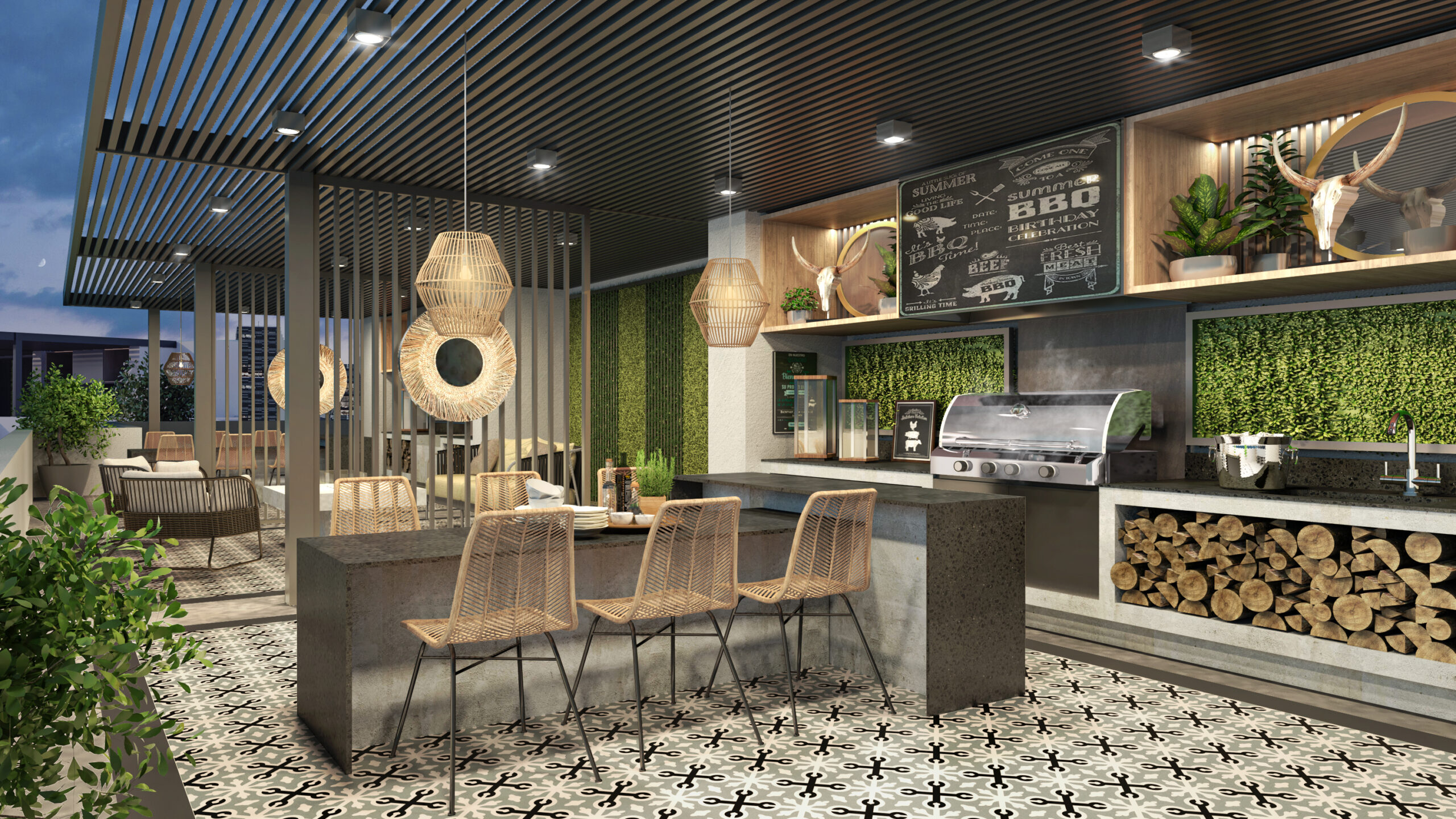 Gran Parque Integrado con más de 2.800m2 de áreas verdes, con un paisajismo que incorpora especies nativas de bajo consumo hídrico, sectores de descanso y esparcimiento. Todo conectado al boulevard de acceso a diversos espacios comunes y que también incluye dos piscinas.